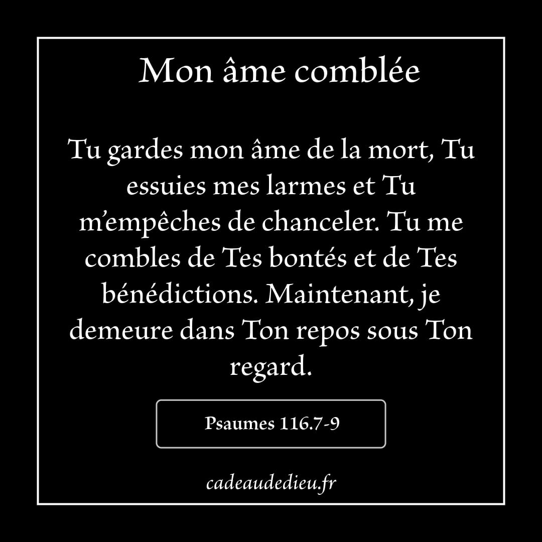 Retrouve donc le calme, mon âme, car l'Éternel t'a fait du bien. Oui, tu m'as fait échapper à la mort, tu as séché mes pleurs, tu m'as préservé de la chute : ainsi, je marcherai encore sous le regard de l'Éternel au pays des vivants.